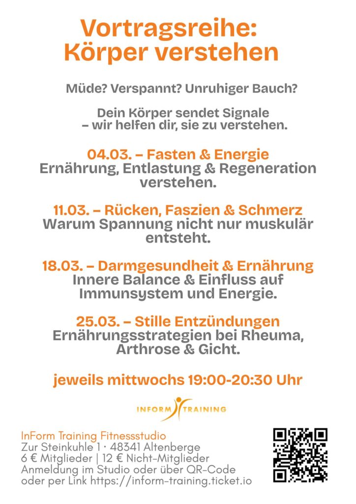 An vier Abenden geht es um Themen, die viele Menschen betreffen: Energie und Stoffwechsel, Rücken- und Fasziengesundheit, Darm und Immunsystem sowie stille Entzündungsprozesse im Körper. Die Vorträge vermitteln verständliches Hintergrundwissen und geben alltagstaugliche Impulse, wie Ernährung und Lebensstil den Körper unterstützen können.